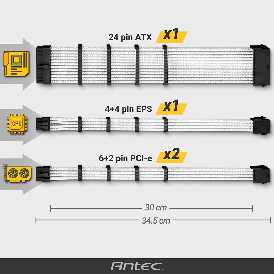 - Premium PET sleeve cables, included:(1) 24-pin ATX; (1) 4+4pin eps; (2)6+2Pin PCI-E ; compatible with all power supplies.