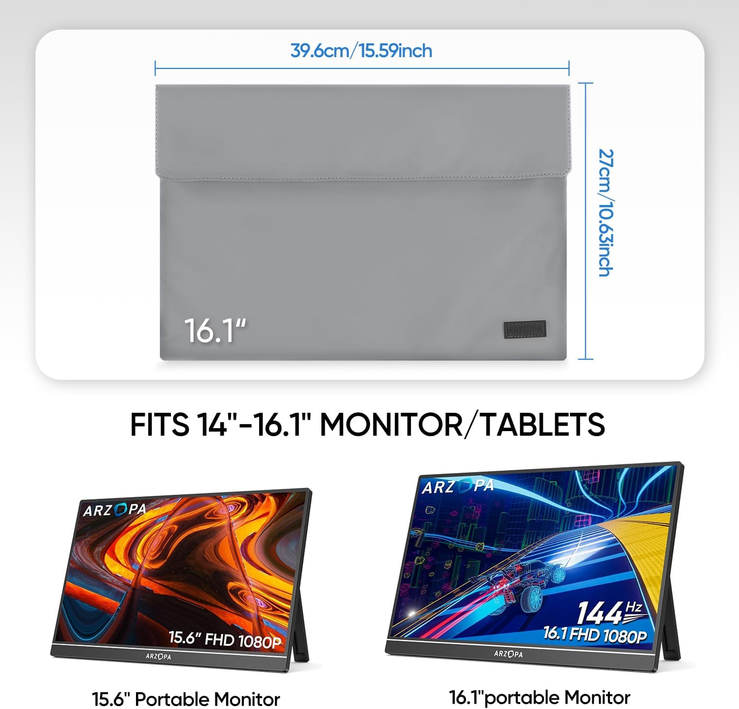 16.1″ Compatible Models: Compatible with portable monitor under 16.1 inches. For ARZOPA S1 Table/A1 GAMUT/A1C/G1 Game. 17”: Compatible with Portable monitor under 17.3 inches. For ARZOPA A1 MAX/A1M.
