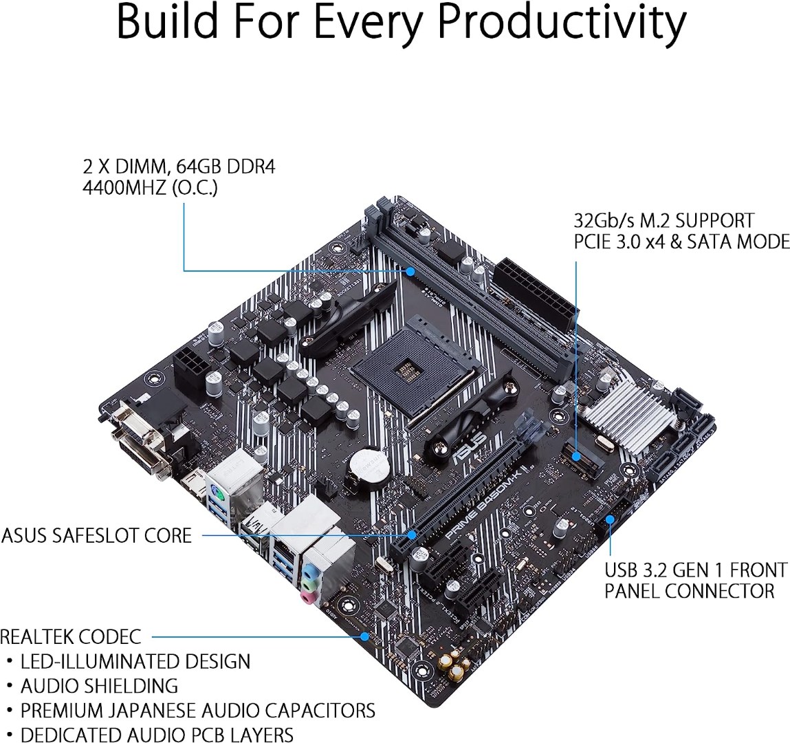 BrandASUSCPU SocketSocket AM4Compatible DevicesPersonal ComputerRAM Memory TechnologyDDR4Chipset TypeAMD B450Memory Clock Speed4400 MHzPlatformWindows 10Memory Storage Capacity1 GBRAM Memory Maximum Size1 GBGraphics Card InterfacePCI Express