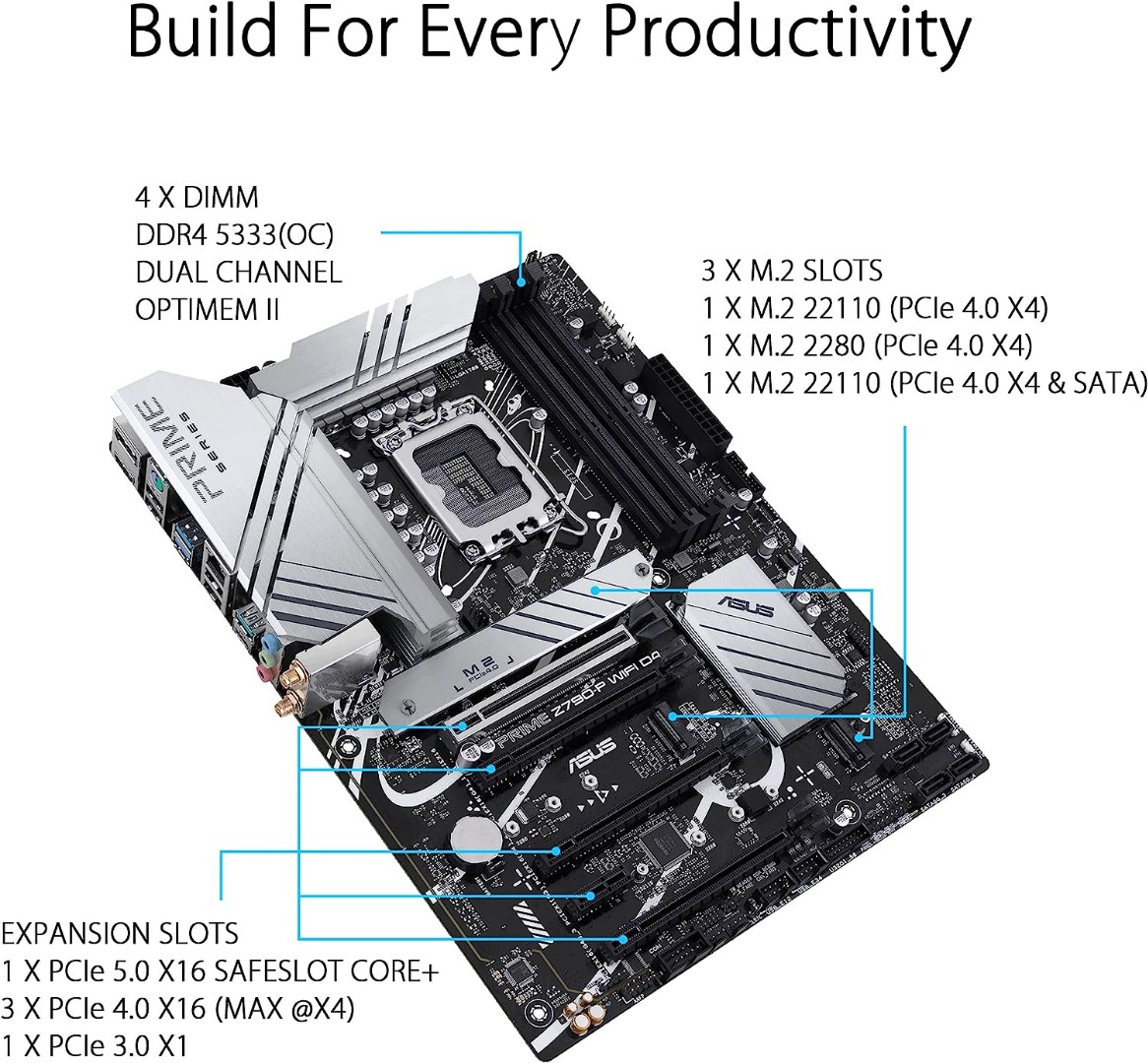 BrandASUSCPU SocketLGA 1700Compatible DevicesPersonal ComputerRAM Memory TechnologyDDR4Chipset TypeIntel Z790Memory Clock Speed5333 MHzPlatformWindowsModel NamePrimeMemory Storage Capacity128 GBRAM Memory Maximum Size128 GB