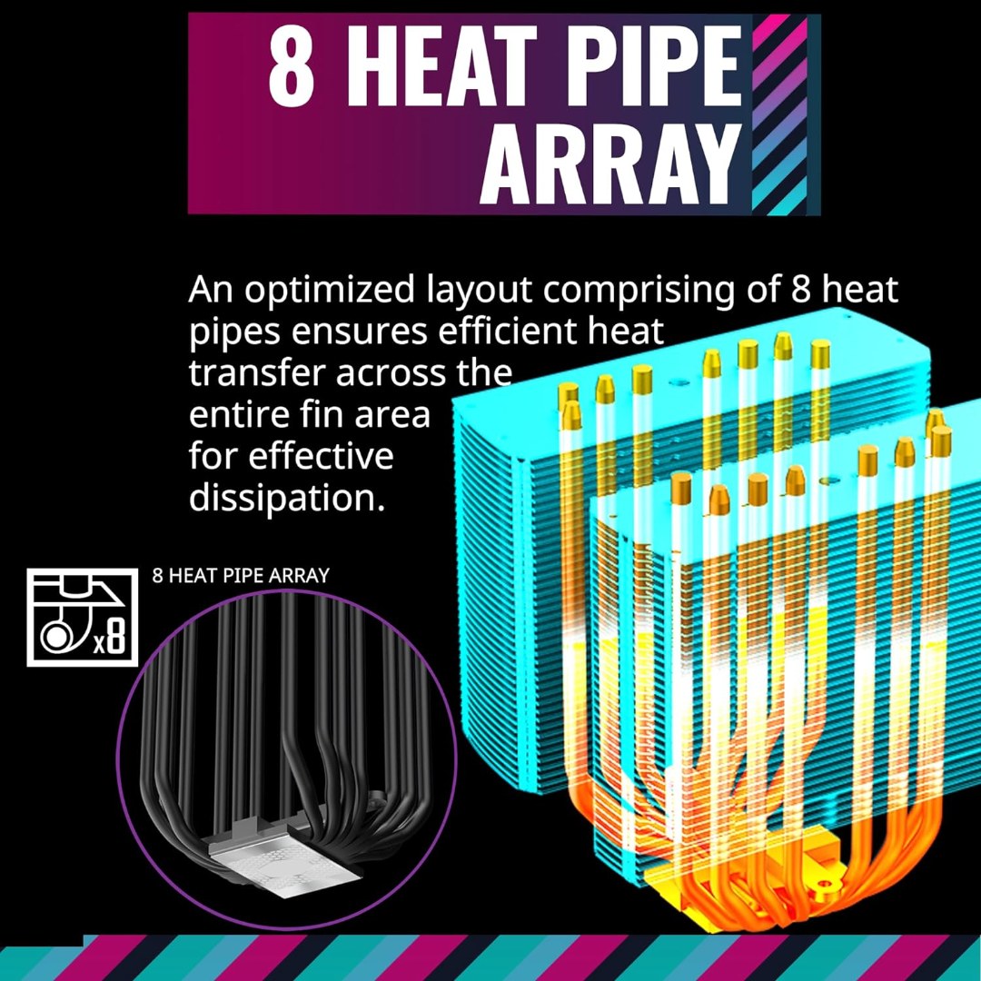 - 8 Heat Pipe Array: An optimized layout comprising of 8 heat pipes ensures efficient heat transfer across the entire fin area for effective dissipation.
