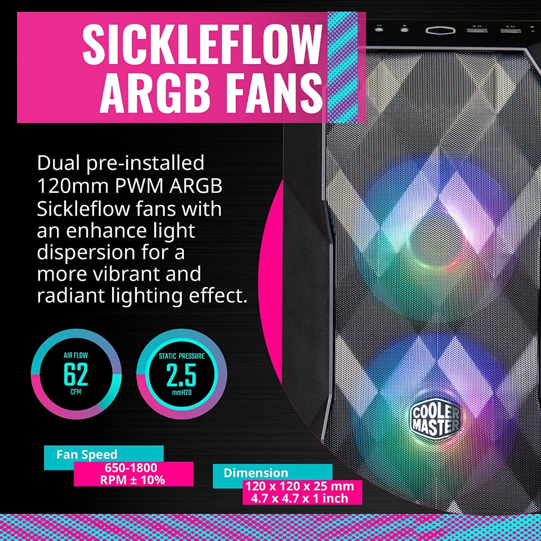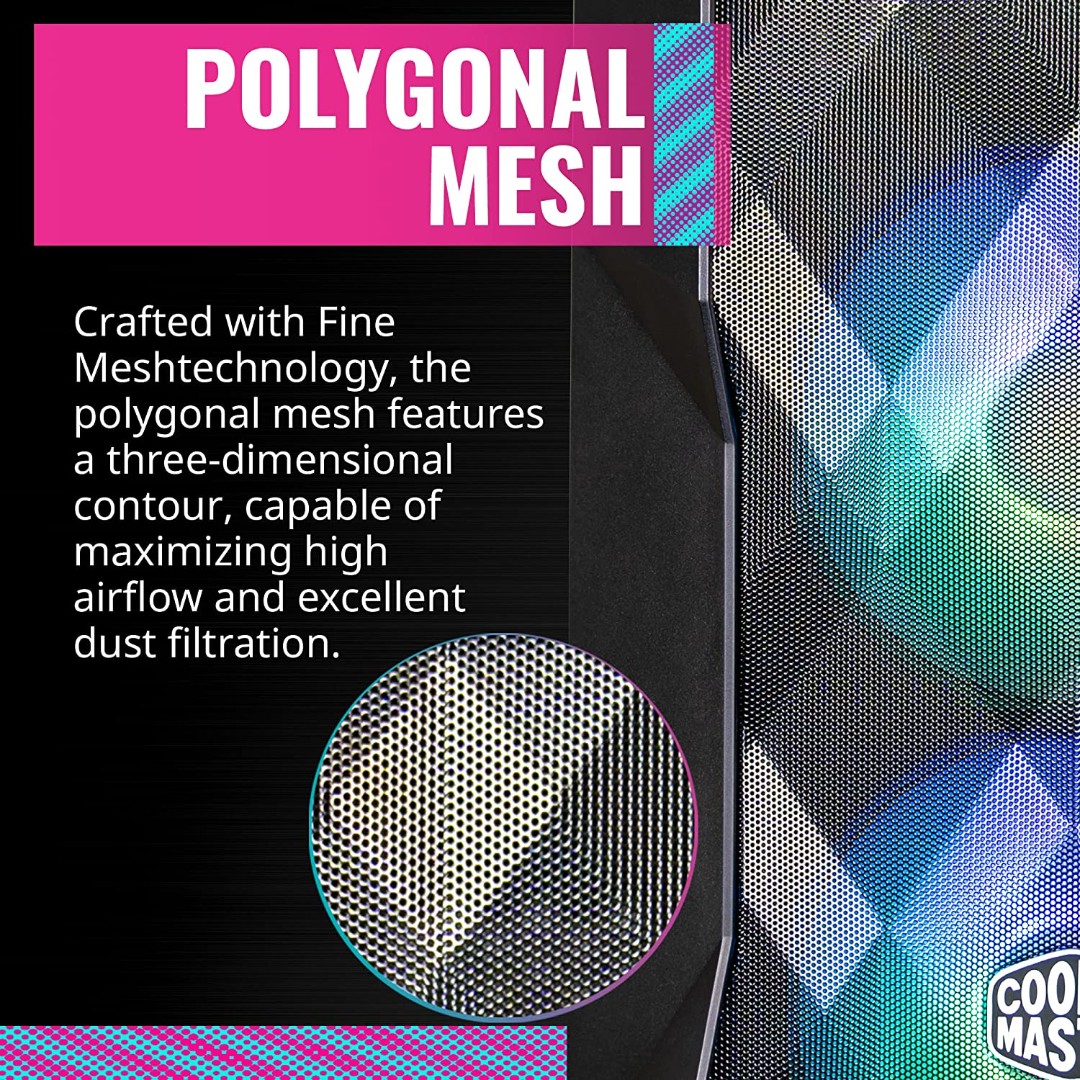 - Polygonal Mesh: Featuring Cooler Master’s FineMesh technology, the polygonal mesh is capable of maximizing airflow as well as dust filtration.