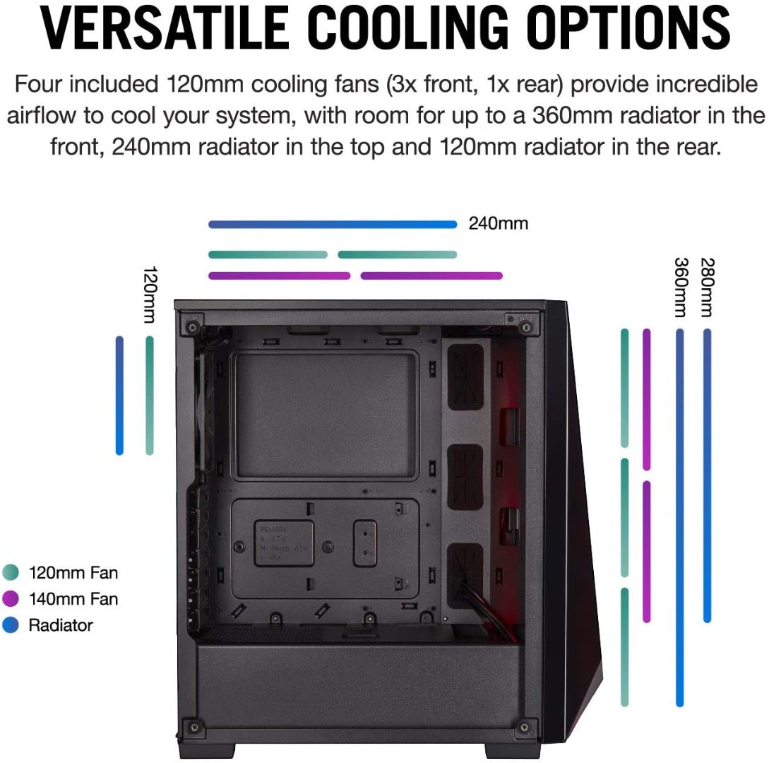 BrandCorsairColorBlackMaterialTempered GlassCooling MethodAirMotherboard CompatabilityATXItem Weight14 PoundsItem Dimensions LxWxH17.32 x 8.27 x 17.72 inchesCase TypeMidi Tower