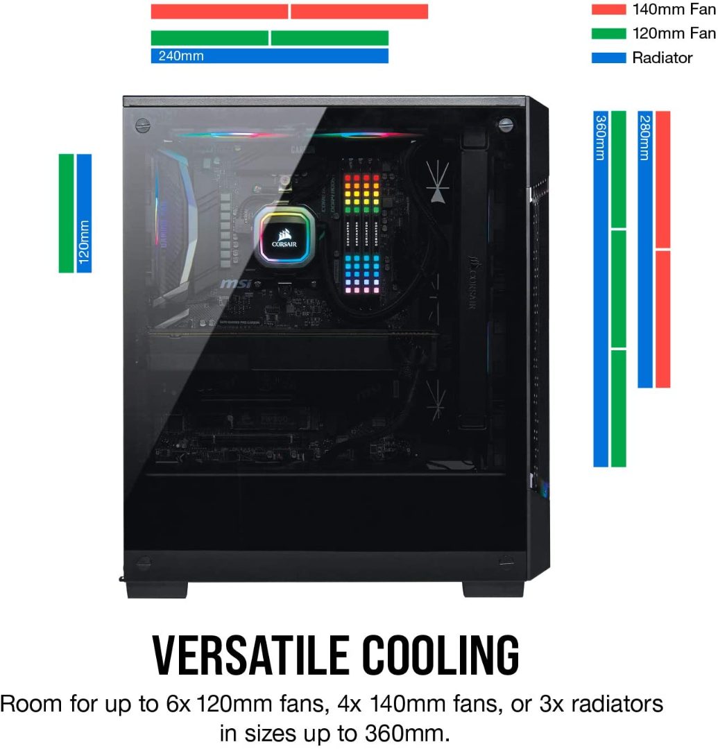 BrandCorsairColorBlackMaterialTempered Glass, Alloy SteelCooling MethodAirMotherboard CompatabilityATXItem Weight6.5 KilogramsItem Dimensions LxWxH15.55 x 8.27 x 17.72 inchesCase TypeFull TowerTotal USB Ports2